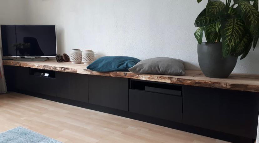 Bij OLwood hebben we een ruime voorraad aan verse en gedroogde planken die geschikt zijn voor diverse projecten. Op de foto rechts hebben we een plank verwerkt tot een tv-meubel.